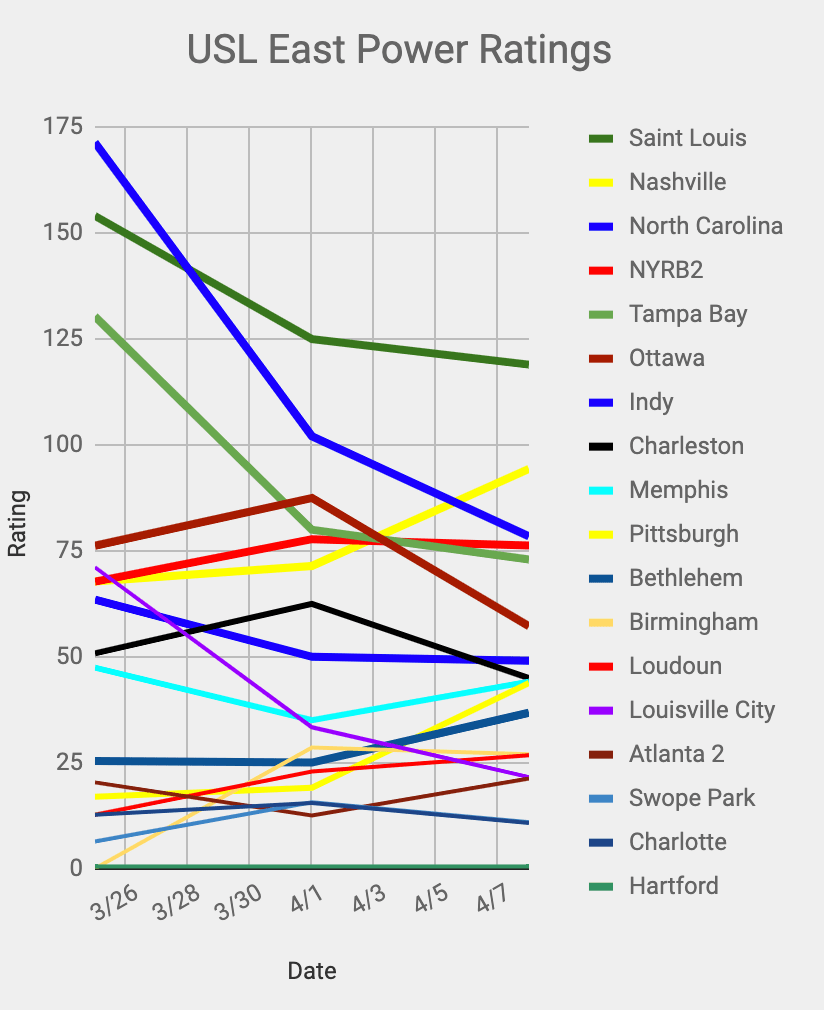 Welcome to the USL power ratings! Herein, I’ll give weekly updates on the Eastern and Western Conference with a projected final table. When there’s enough data, I’ll expand the variety of rankings available.