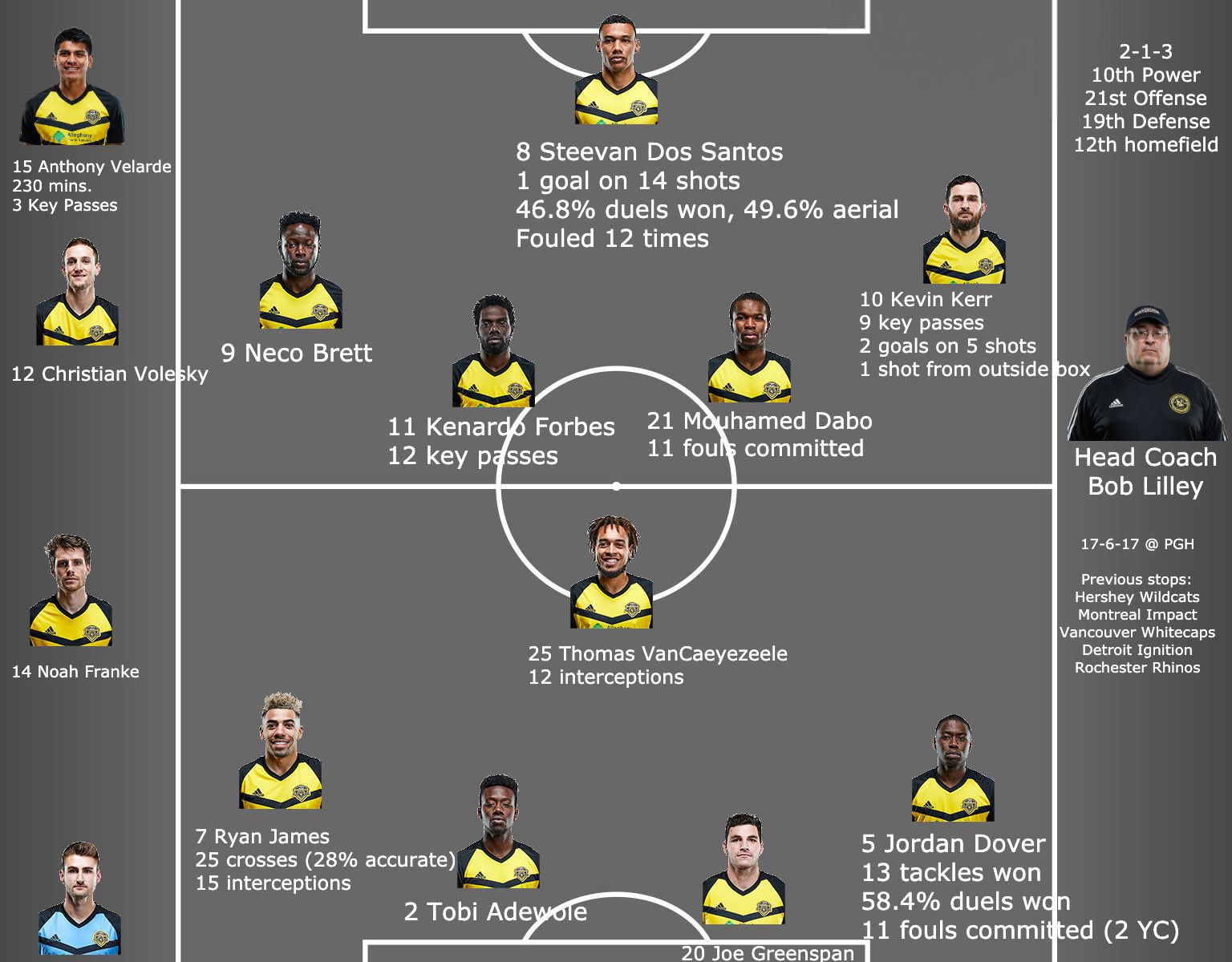 The leaders offensively are striker Steevan Dos Santos, winger/midfielder Kevin Kerr, and defensively, centerback Joe Greenspan and left back (and former Nashville SC player) Ryan James. Dos Santos is the straw the stirs the drink, and though nominally a single-high forward, he’s also capable of dropping into a “false 9” role, where he collects in midfield.