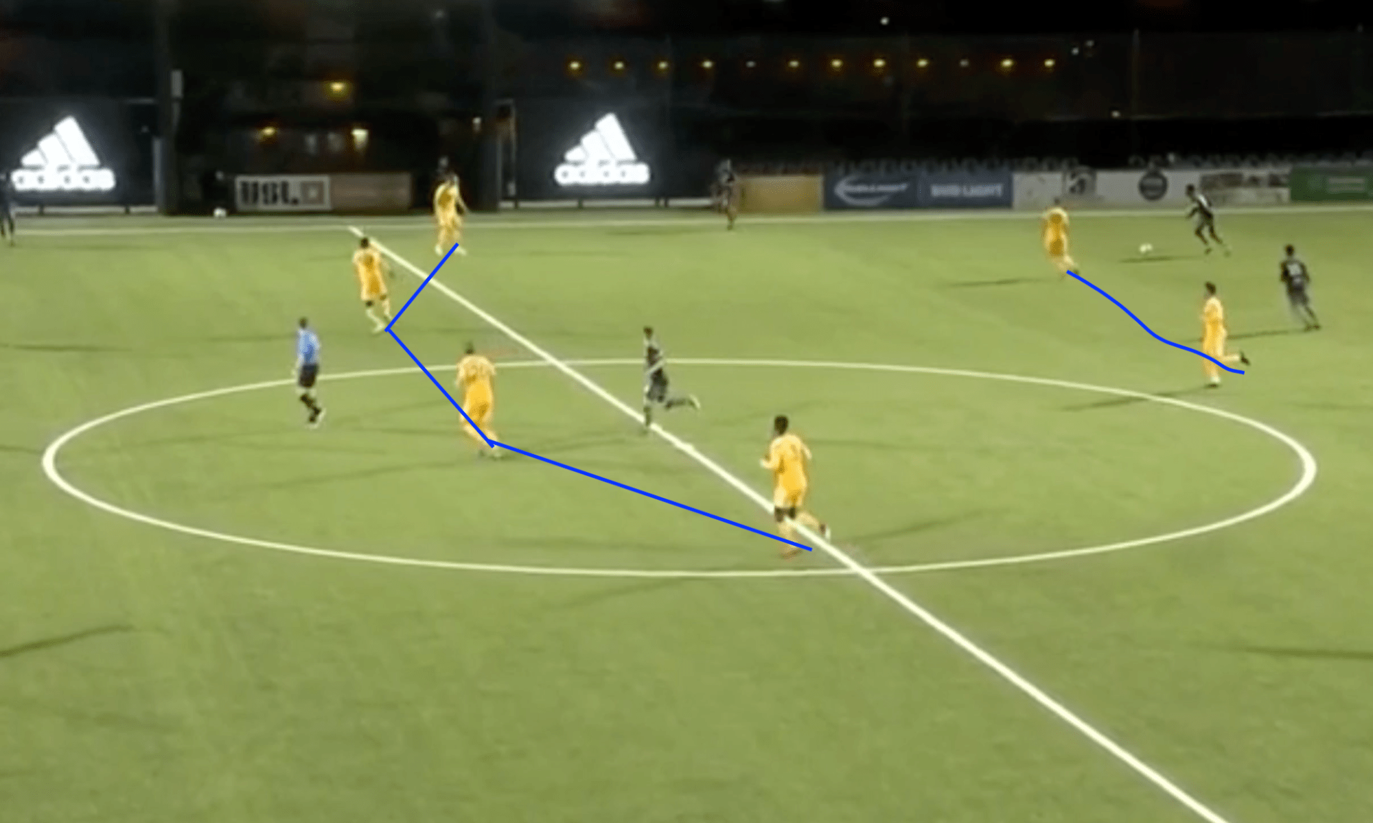 There’s not even a particularly complex set of passing movements to draw NSC’s lines so far out of position: Bradley Bourgeois has to step to the left to account for the ball over the top, he and Ken Tribbett only have OK communication as a centerback pairing (Liam Doyle has actually shifted to left back!), Tribbett steps up to deal with the backpass, and Justin Davis slides back to recover help at the left back as Doyle covers for Tribbett…