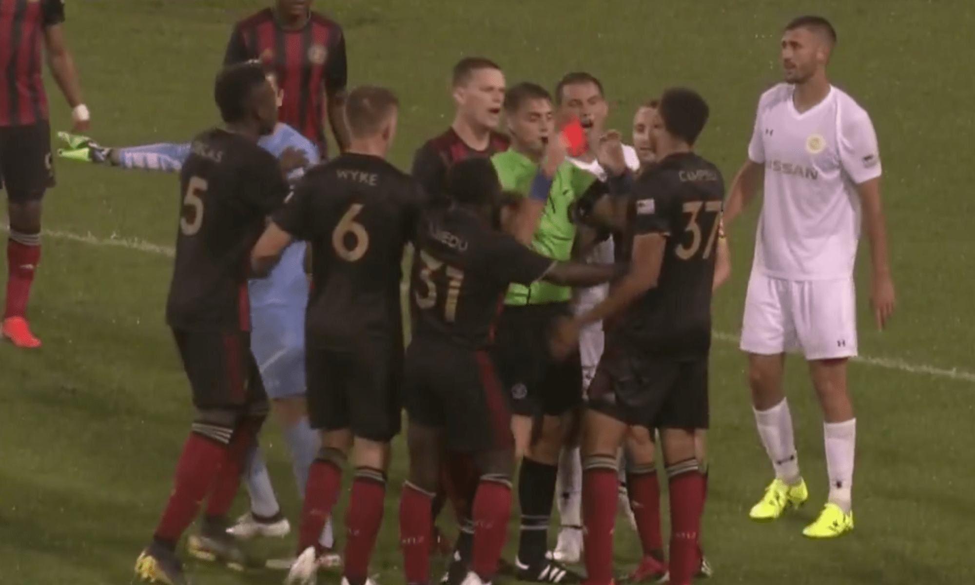 - 76′ ATL RED CARD – 37 George Campbell (foul)