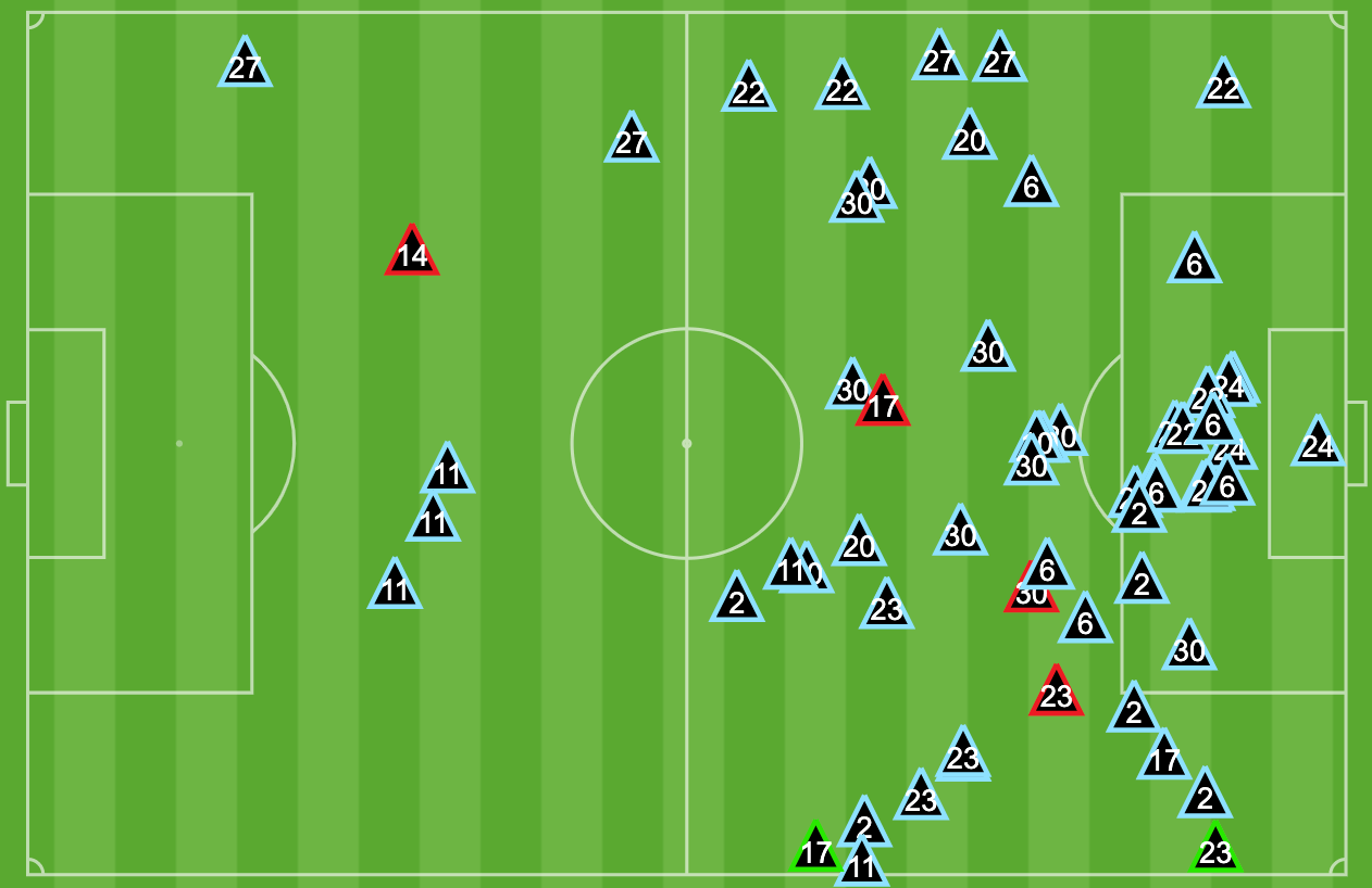That was particularly true once the field conditions went downhill. Here are Nashville SC’s defensive actions before the hourlong lightning delay, and those after. The Boys in Gold (white) were attacking right-to-left: