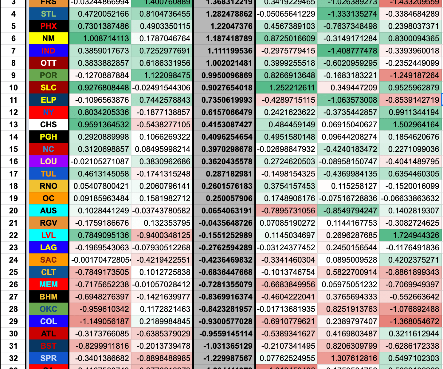 Since I just had to spill a lot of virtual ink explaining the concept, I’ll keep commentary to a minimum for now. HFA is homefield advantage (measured in home score minus road score), so teams with a negative mark are actually performing better on the road so far. That doesn’t necessarily mean they’re bad at home (Nashville has a negative HFA despite a positive home grade), just that they perform better compared to average on the road.