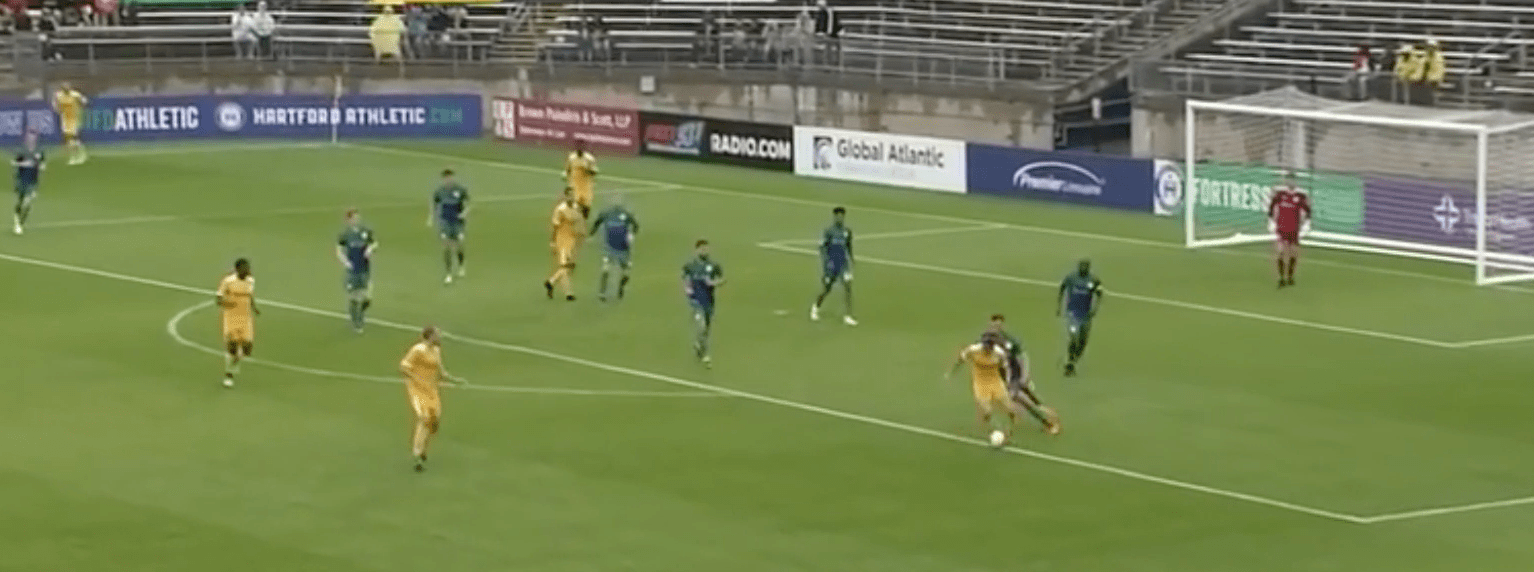 Nashville was a little more direct on this play, but you can see why crosses were such a big part of the gameplan: Hartford was willing to give them up, hoping Nashville couldn’t convert. That mostly held true – none of Nashville’s goals came directly from crossing service into the box in the settled defense – but the Boys in Gold had enough individual quality, and the desire to throw numbers forward, to score three goals nonetheless. It didn’t happen on this play, but proving that there’s a willingness to take a shot from that location will eventually loosen up even a packed-in defense.