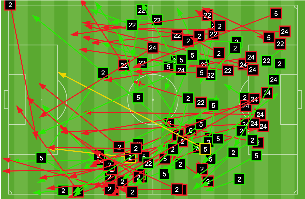 That’s way, way more long passes than Nashville would like to play generally. Especially if you contextualize that Justin Davis tends to get higher up the pitch anyway (though his passing success higher up that left touchline didn’t seem to pay off a ton either, with lots of red in there), the backline and keeper found themselves having to boot it up the field to get over Louisville’s voracious front.