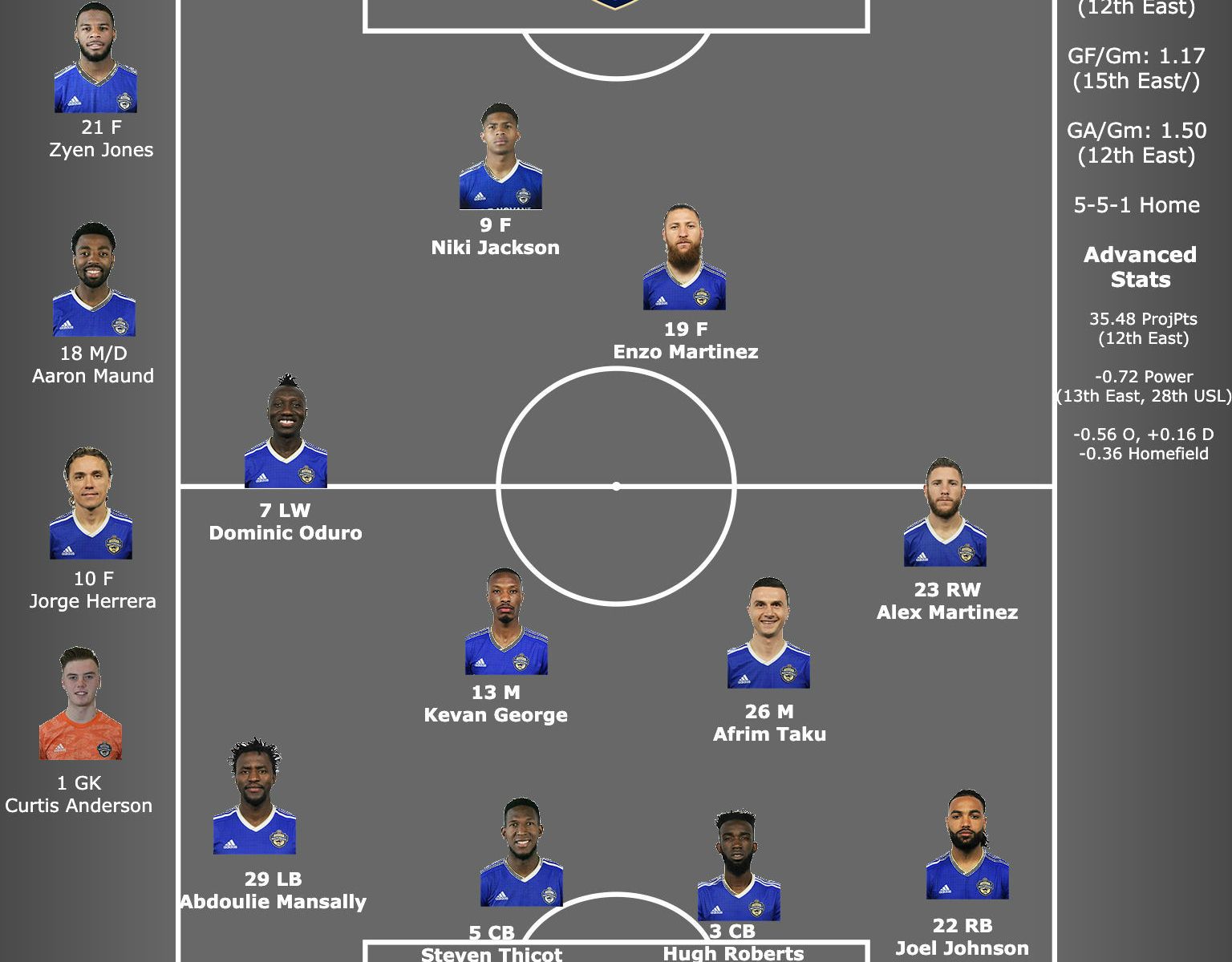 Charlotte has a few really good players: second forward Enzo Martinez happens to be one of the most productive USL players in a a single season with 16 in 2017 – and spent much of the past year in MLS with the Colorado Rapids – while Dominic Oduro leads the team with seven goals so far in 2019, with methuselan Jorge Herrera (who seems older than 38, which is still really old) right behind him with six. Martinez leads the team with six assists, but has just two goals.