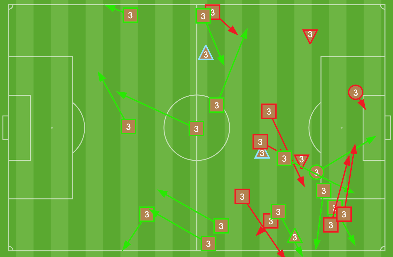 On the left you have the passmap (squares), shots (circles), dribbles (upside-down triangles) and defensive (upwards-pointing triangles) actions, and on the right, those are mostly boiled down into the touchmap.