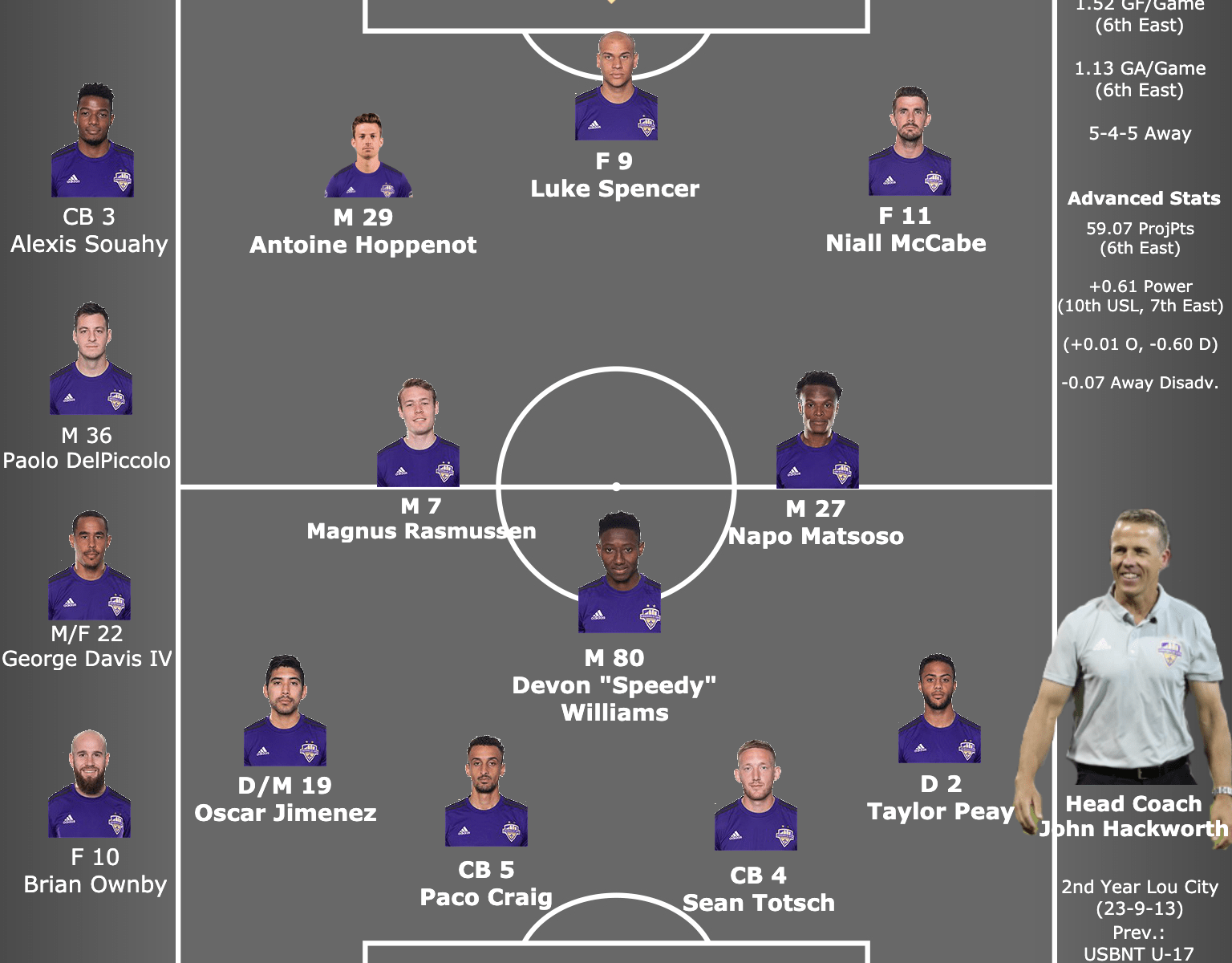 With that change in formation has come an extremely slight uptick in offensive output, but Louisville has really improved defensively. The raw numbers don’t tell the whole story, but the advanced stats paint a picture: they’re still right around average in putting the ball into the back of the net, but have gone from right about average on D to the No. 8 unit in all USL (fifth in the East) since last time these teams met up.