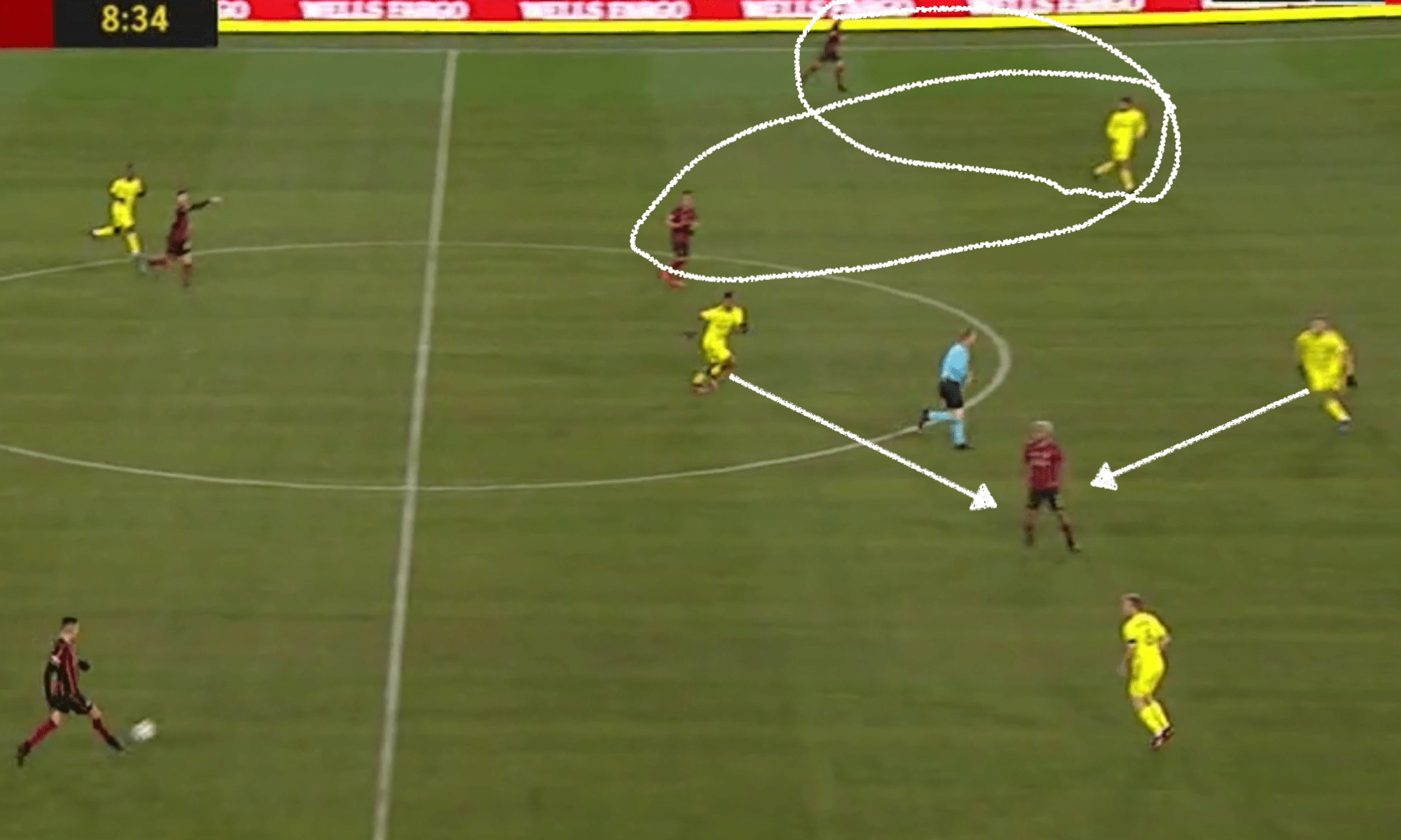 The first big problem here, though, takes place at the point of Escobar’s pass. Walker Zimmerman and Anibal Godoy move to mark Martinez, leaving Miller one-on-two at the back.
