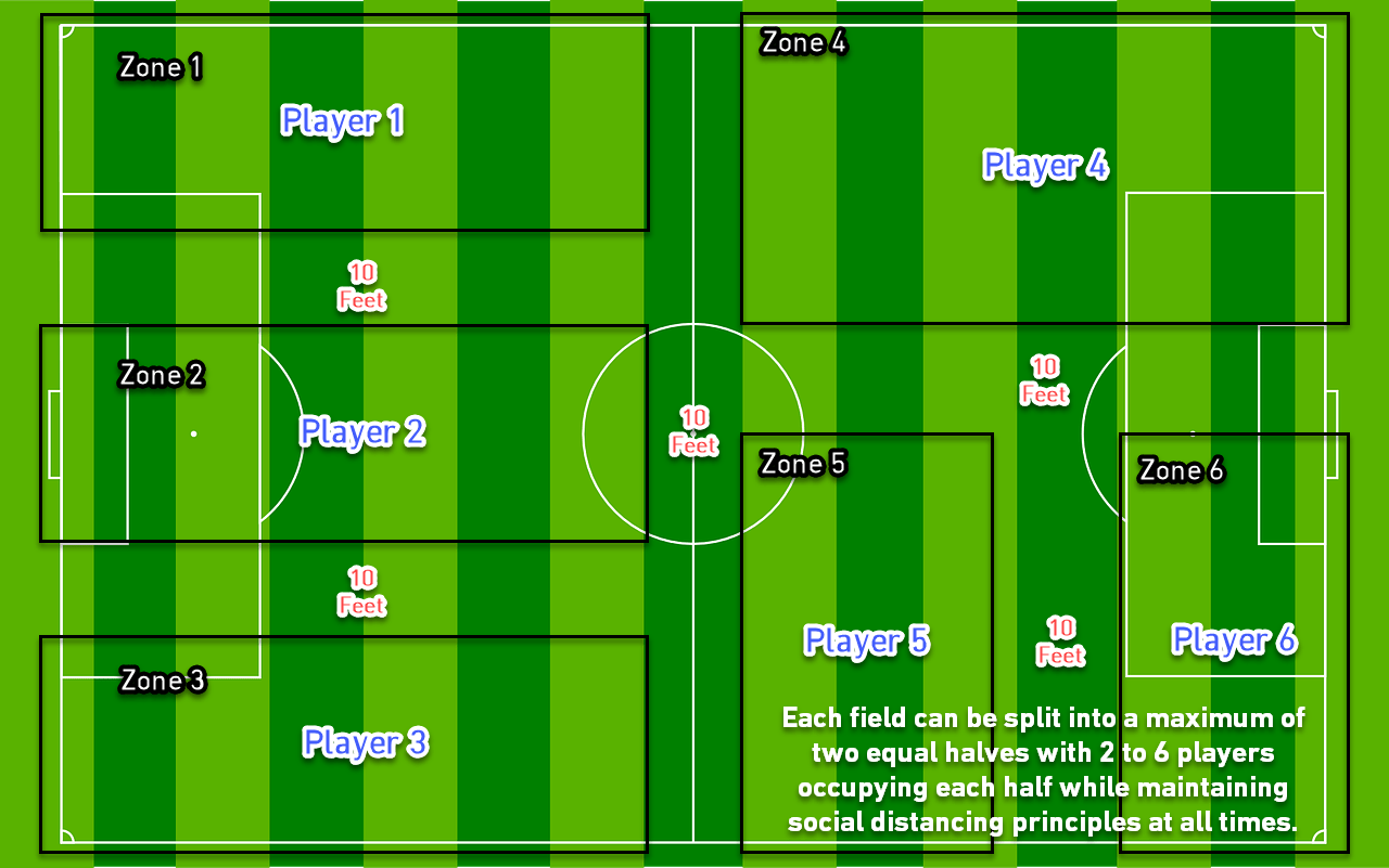 - Clubs may clearly define up to six zones per half field, spaced at least 10 feet apart. Only one player may be in a zone at any given time in order to maintain physical distancing standards throughout the session. For clarity, a maximum of six players may be assigned to a single group with each player accommodated in a separate zone.