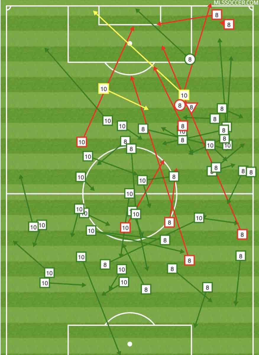 Either way, interconnecting along that right side was more progressive, with fewer passes away from the goal (and while the intended recipients aren’t shown here, more passes between Leal and Mukhtar, rather than less-ambitious involvement of fullback Alistair Johnston). Connecting on the scoring play was nice, but it wasn’t the only chance that pair had to play the ball to each other, and you’re seeing less of the “short pass incomplete” in the attacking third that’s plagued the team early in the year and prevented shots from even getting off.