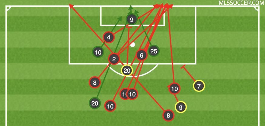 10 of those 16 shots came from outside the box, only one of which was on-target. Three Nashville shots were blocked before they could trouble keeper Luis Robles, and two of those blocks occurred well outside his penalty area.
