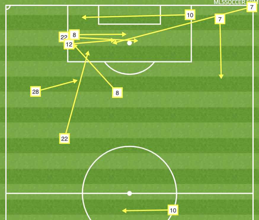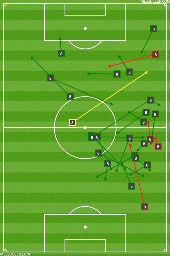 His goal against Orlando City in the midweek didn’t necessarily help him find his finishing touch, but it did let him play a little more freely, and connect more consistently with his teammates. The passing chart at the right shows that he wasn’t perfect in passing, but for a guy who you’re relying on to maintain possession and do so in dangerous areas, there’s not a whole lot to dislike here.
