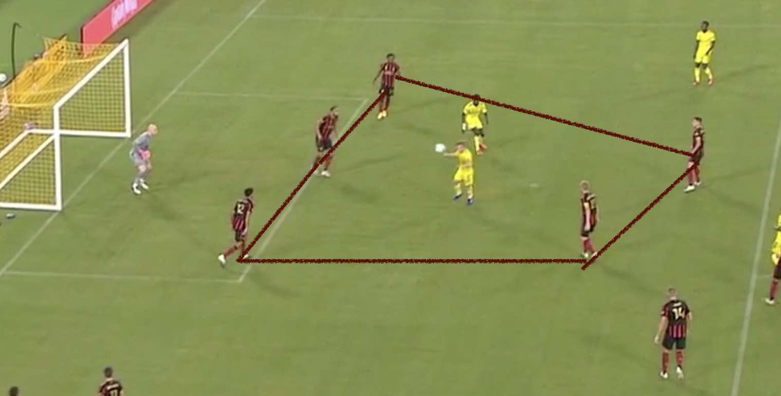 With Lennon and Escobar’s roles switched, Atlanta’s shape wouldn’t be that bad, save for the fact that Lennon is getting back to his feet and looking for a whistle, rather than running shoulder-to-shoulder with Lovitz. That turns it into a one-v-one battle in which he starts at a disadvantage, and can’t make up the ground. Of course, losing that one-v-one battle only means that Nashville SC gets a cross off.