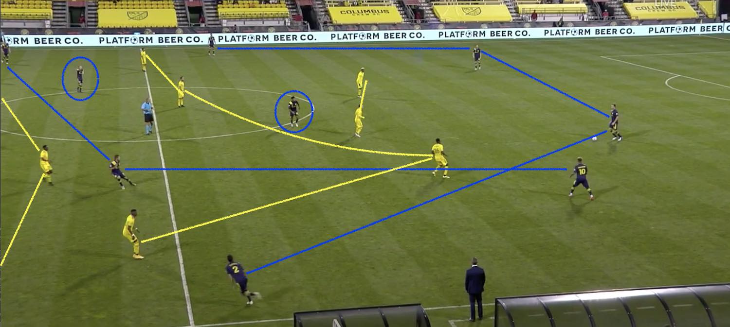 You can also see Alan Winn on a run designed to stretch the Columbus backline. Again, that’s working! Jonathan Mensah is not in what you’d call an ideal position for a centerback. With the Columbus fullbacks held wide (on the far side, you can see Alex Muyl holding his marker to the touchline, while on the nearside 2 Dan Lovitz is threatening a run behind RM Luís Díaz, so the fullback is providing some cover there.