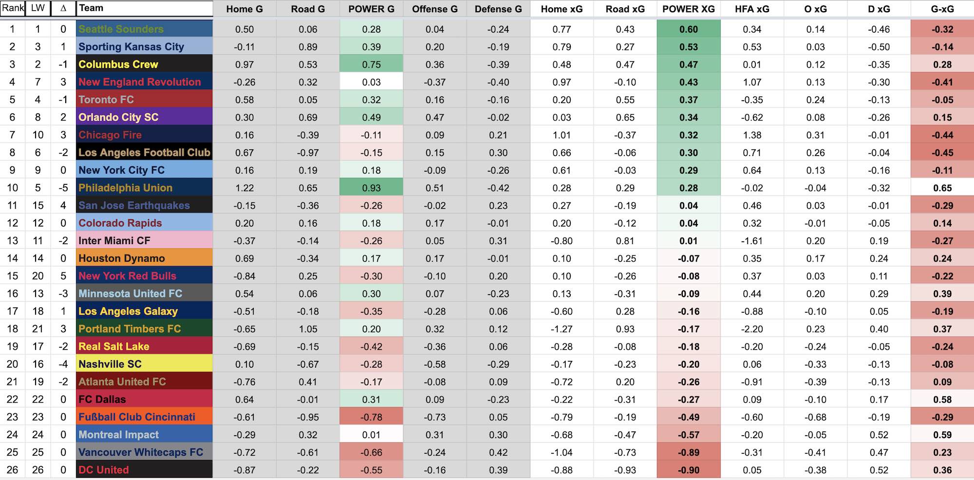 The midweek was kind to New England, San Jose, New York Red Bulls, and Portland in xG terms, even though the soccer gods frowned upon the Revs (lost a 1-0 game to Toronto FC in which they won the xG battle 2.17-1.15) and NYRB (lost 2-1 to Inter Miami despite a 1.87-0.94 xG advantage). It was less kind to Philly – largely because of the out-of-town scoreboard, though “only” leading Cincy 1.13-0.58 in xG terms in a 3-0 win is… not gonna bug the Union faithful – Minnesota United, and Nashville.