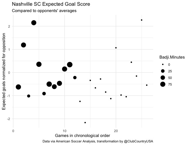 We have clear with-Badji and after-Badji splits here. So how much of Nashville’s late-season offensive improvement was real? Or was it mostly a mirage based upon outperforming xG in small sample sizes (a good thing to do! but over larger sample sizes, not likely to repeat), playing poor defensive competition (Houston and Dallas twice a pop, Chicago once, a generally mediocre and very decimated Miami), and the simple lies our memories tell us?