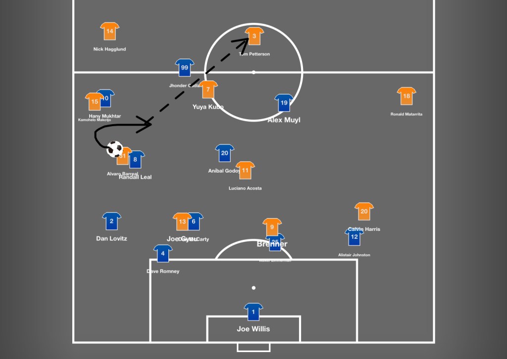The teams are trading their opening salvos, without a ton in it for either side (indeed, this play would result in the first shot of the game, and first goal of the season). After Joe Gyau loses control of the ball up the sideline – thanks to solid defensive work from Randall Leal and Dax McCarty – defensive midfielder Kamohelo Makotjo recovers, and zips a first-touch pass to winger Alvaro Barreal.