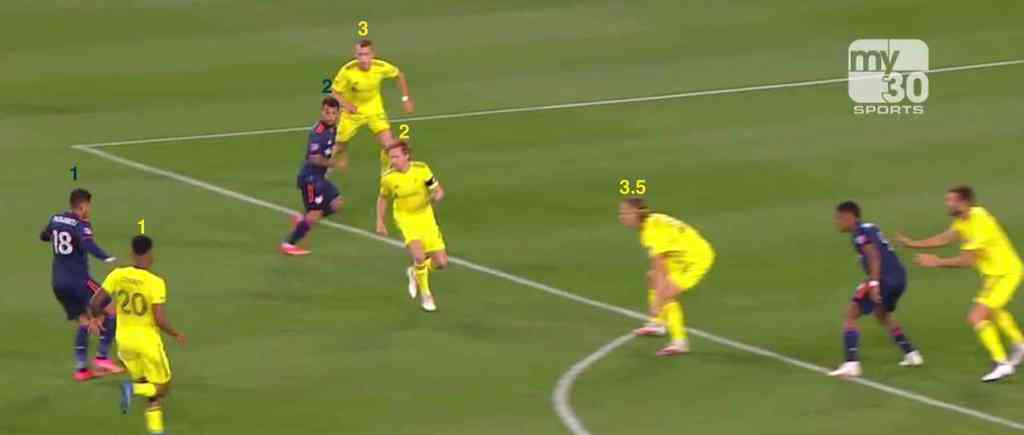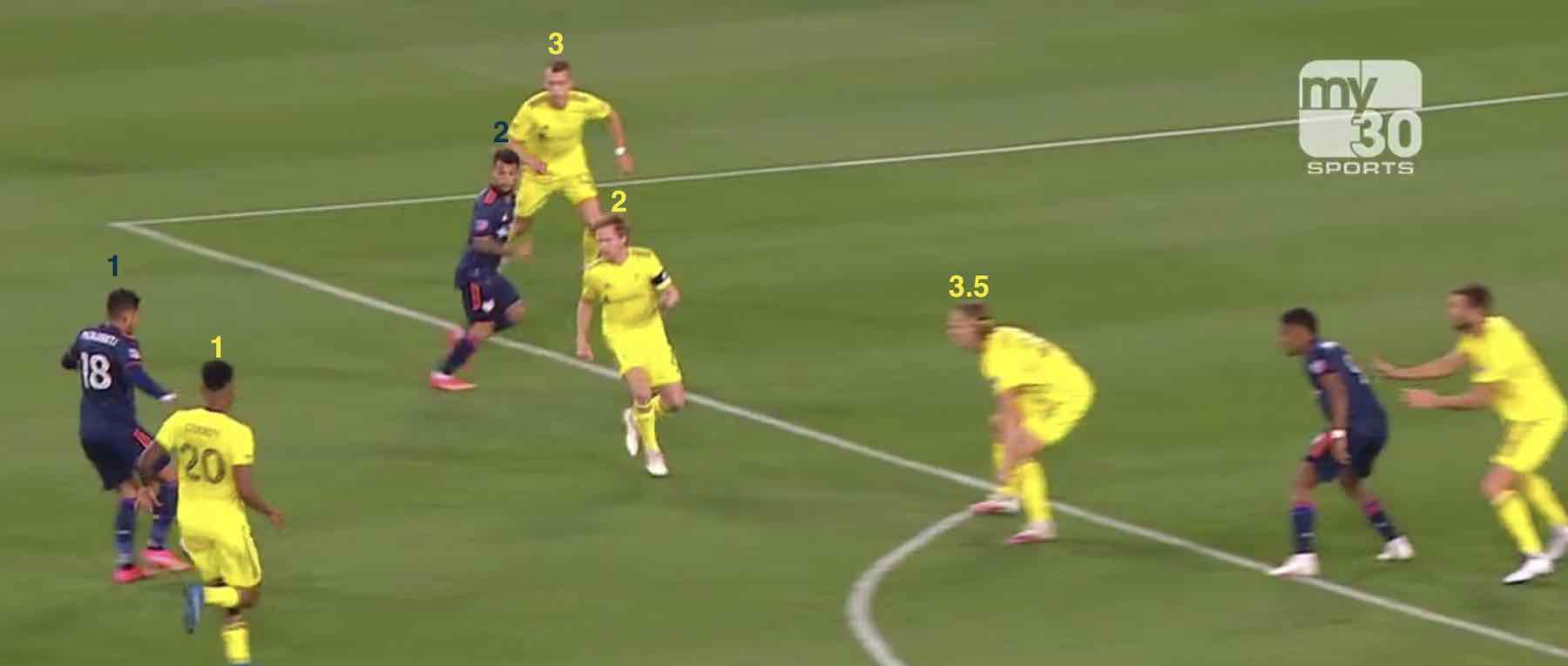 However, Nashville SC’s formation is narrow and heavily shifted (defense’s) left as the Boys in Gold tried to pin the ball on the sideline. With the skip pass and a smart use of spacing from LB Ronald Matarrita, Nashville right winger Alex Muyl isn’t in position to quickly man-mark the Costa Rican, and he has a chance to collect the ball, pick his head up, and plan his next pass-and run.