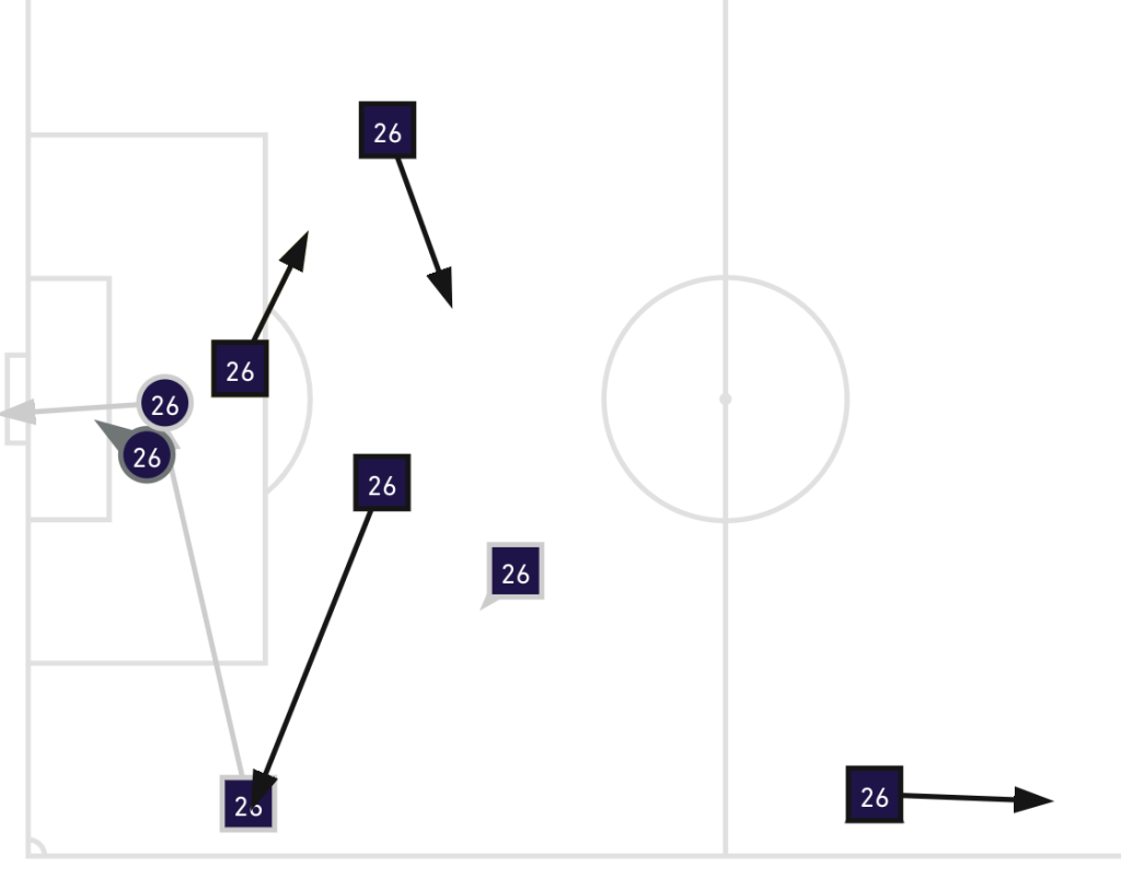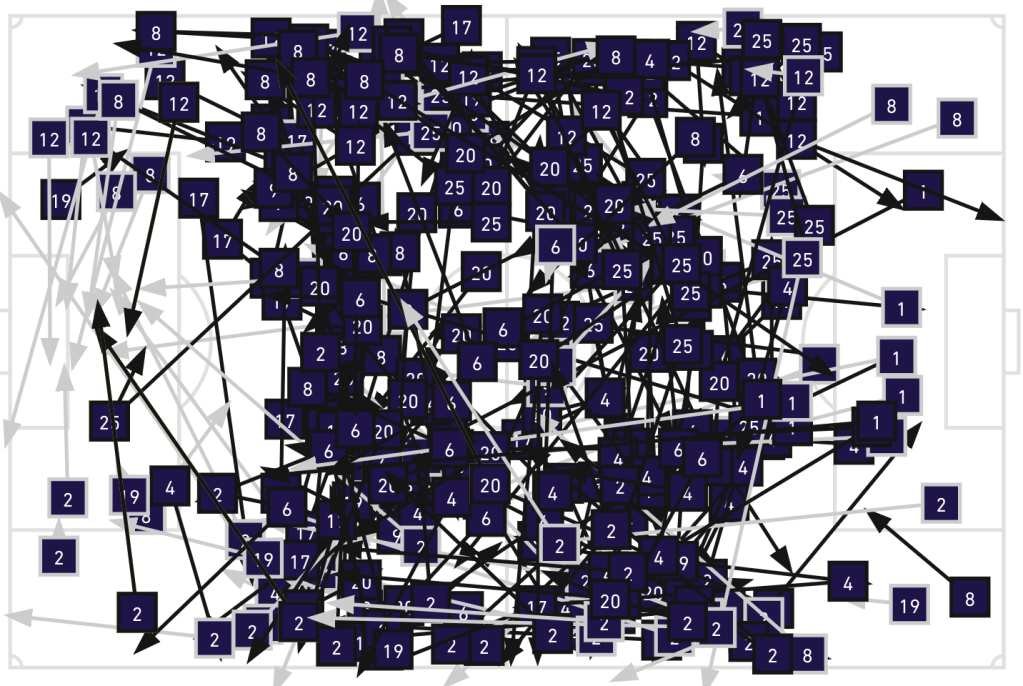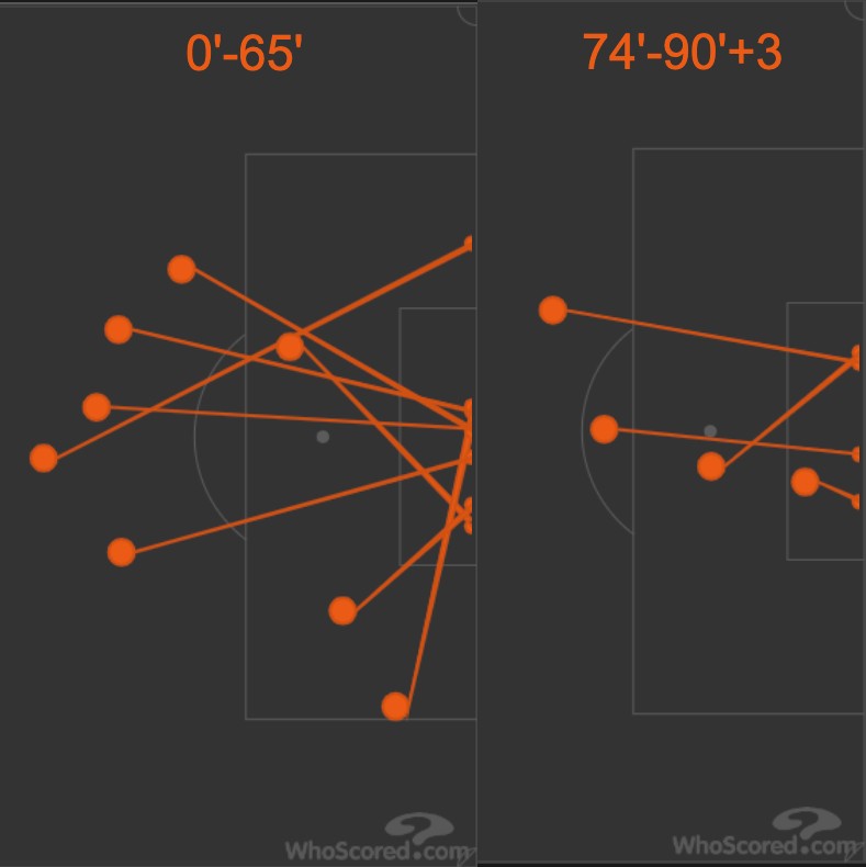 While the Boys in Gold couldn’t quite get right to the top of the penalty area, there’s some decent penetration into zone 14. There are also a bunch of passes into the box in dangerous areas.