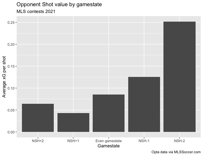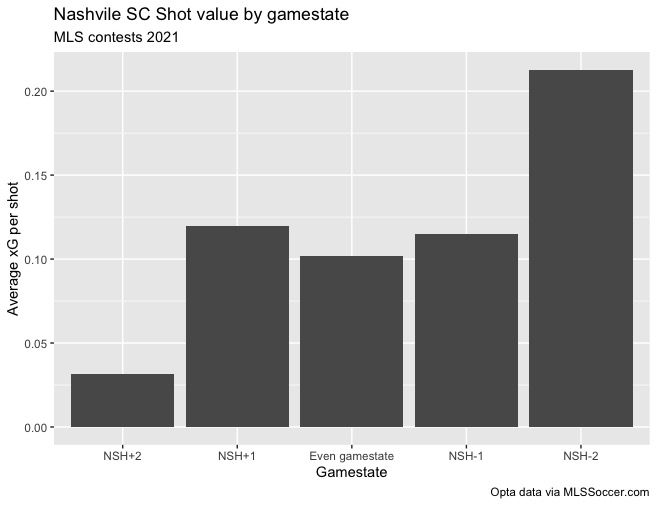 One other oddity: Nashville is finding its best shots not when nursing a big lead (and therefore able to be selective), but rather when trailing by a pair – when you’d expect they’re launching anything and everything to claw back, hoping that a low-xG opportunity finds a bit of magic. Some of that is a statistical quirk of the Opta xG formula, which includes an arbitrary “big chance” flag that amps up the value of a shot. Some of it might be gameplan stuff for the staff to consider. Here’s the value NSC is getting per-shot by gamestate: