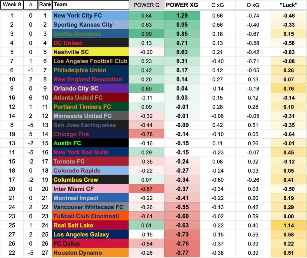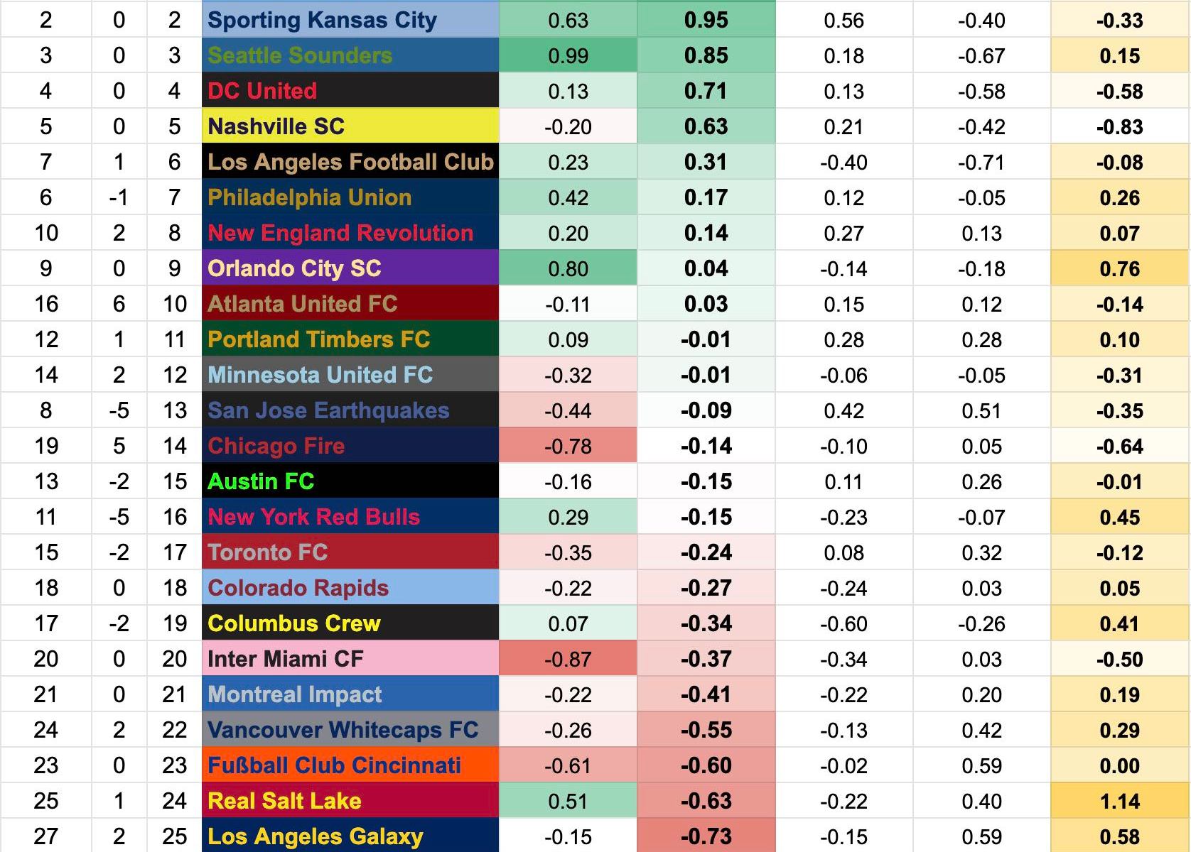 Important note! Although I didn’t publish after Week Nine, the deltas are compared to the Week Nine rankings. So NYCFC is a spot higher than you saw last time, but that move was primarily on account of the xG blasting of Atlanta, not a blasé match against DC United.