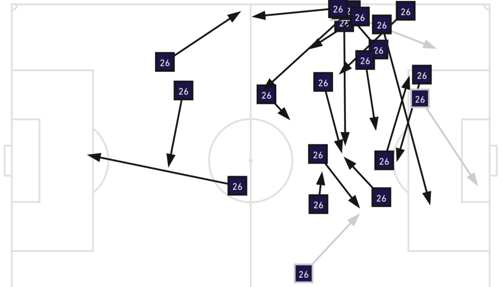He continued to nail that ball against Montreal, too (obviously in different circumstances), even though a lot of his other action was a bit more conservative – which you can see on the right. Those represented and even larger proportion of his game as Nashville dominated the ball quite a bit more.