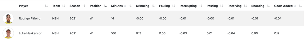 Here’s what American Soccer Analysis‘s Goals Added has to say – with sample sizes so small as to be not particularly revealing anyway. Neither of them has done anything to impress the numbers on defense (again, limited to event data here – positional play and spacing are important aspects and not captured).