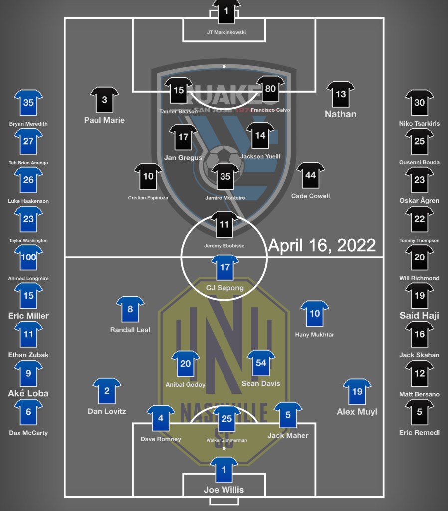 - 72′ SJ GOAL – 11 Jeremy Ebobisse (right-foot half-volley), assisted by 17 Jan Gregus (deflected clearance from set-piece situation)