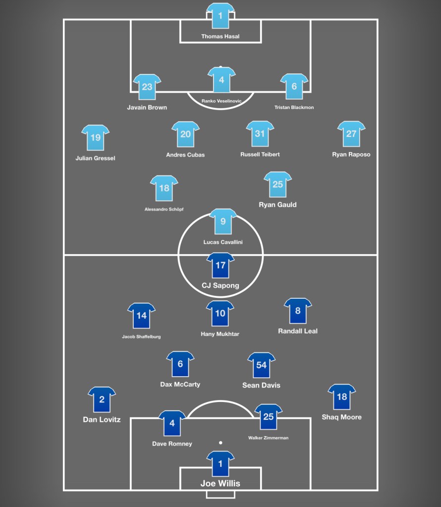 Marcus Godinho has played LWB opposite Gressel in the only game since his arrival, but Ryan Raposo, Pedro Vite, and Cristian Dajome are also in a rotation there – in addition to getting time as the attacking mids in a more pure 3-4-2-1 than NSC plays. Russell Teibert is the closest thing to a stalwart in central midfield, with Andés Cubas’s later April arrival obscuring that he’s clearly the preferred starter. Teibert is an absolute non-entity in attack, but a solid (if uninspiring) defensive player. Cubas is a destroyer who can advance the ball a little more cleanly than Teibert. According to Har, Teibert did not travel, however.