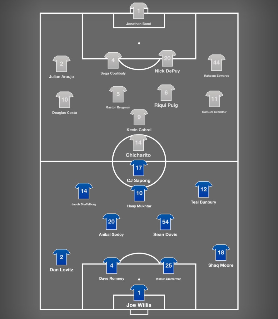 …a backline of, from left to right, Kelvin Leerdam, Nick DePuy (Derrick Williams replacing him due to injury in the past couple games), Sega Coulibaly, and Julián Araujo (like Alvarez, a former US Youth International who has pledged his future to El Trí).