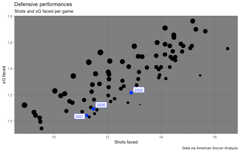The xG allowed per shot remains pretty low (though not as Orlando’s FC Dallas’s 2020s, and Philly last year), but Nashville allowed a shot and a half more per game than in previous seasons.