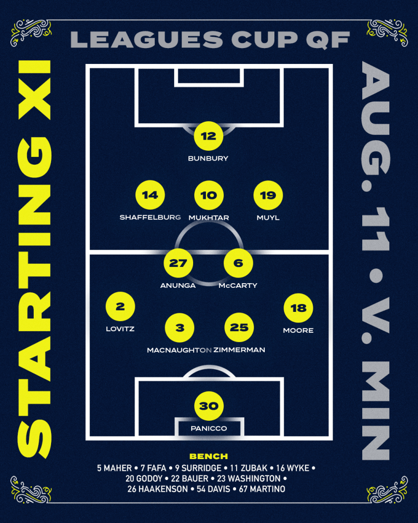 - 39′ NSH GOAL – 18 Shaq Moore (right-footed, first time), assisted by 10 Hany Mukhtar (layoff pass(?) from close range) and 14 Jacob Shaffelburg (left-footed cross from left wing)